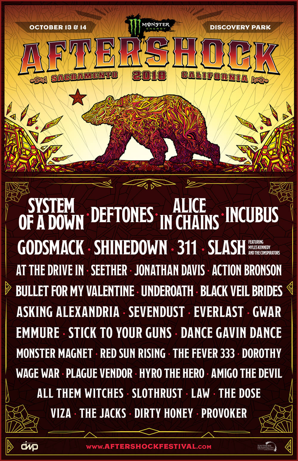 Monster Energy Aftershock wrapped its biggest year ever, with 60,000 in attendance over a sold-out weekend October 13 & 14 at Discovery Park in Sacramento, CA. System Of A Down and Sacramento natives Deftones headlined the 7th annual festival, joined by Alice In Chains, Incubus, Godsmack, Shinedown, 311, Slash featuring Myles Kennedy And The Conspirators, At The Drive In, Seether and many more. Even with expanded capacity for this year’s festival, weekend passes for Monster Energy Aftershock were sold out months in advance.