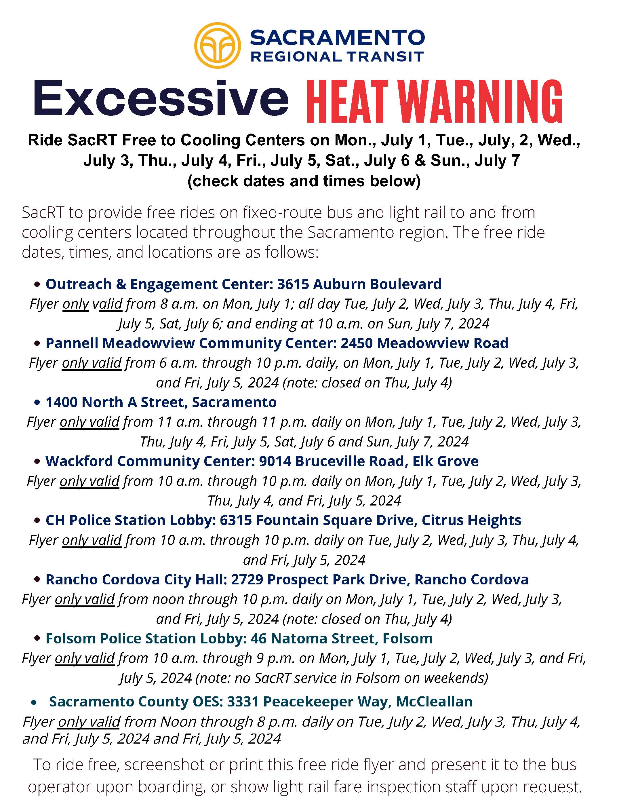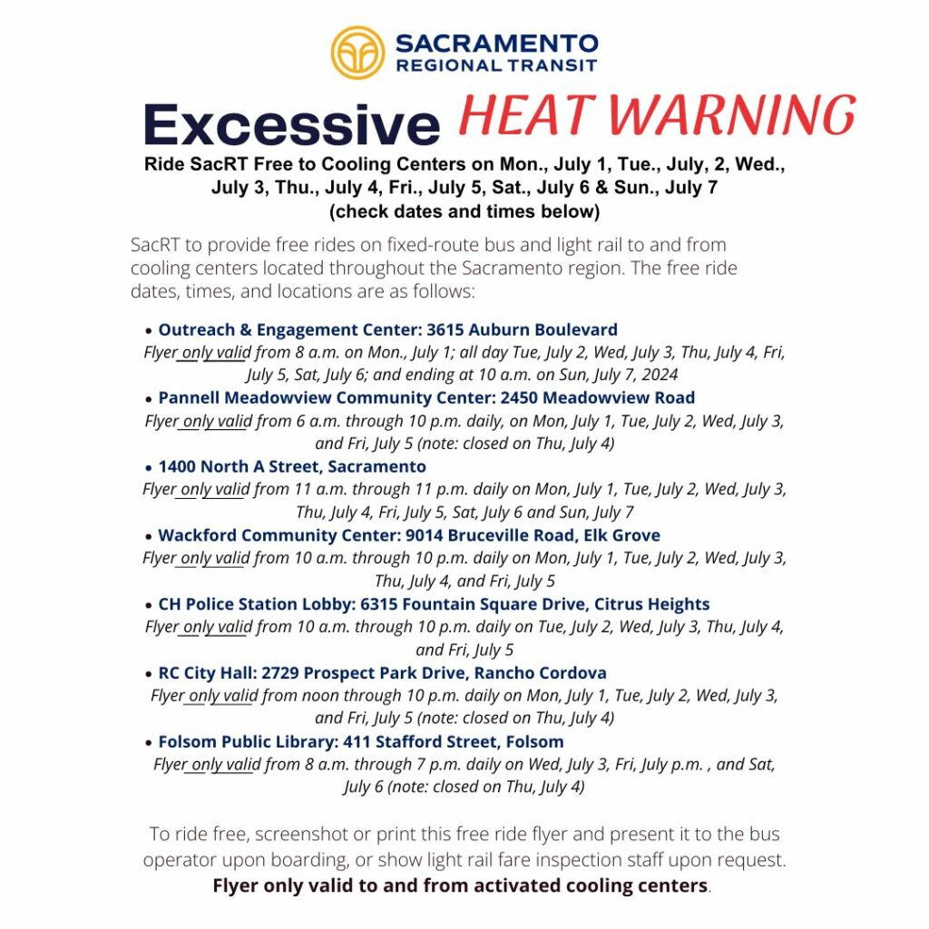 Sacramento Regional Transit (SacRT) will be providing vouchers for free rides to and from the cooling centers for this event. Riders can Ride Free with the Flyer provided by RT by printing the flyer or showing it on a digital device. Free rides are good for two hours before and after cooling center hours.