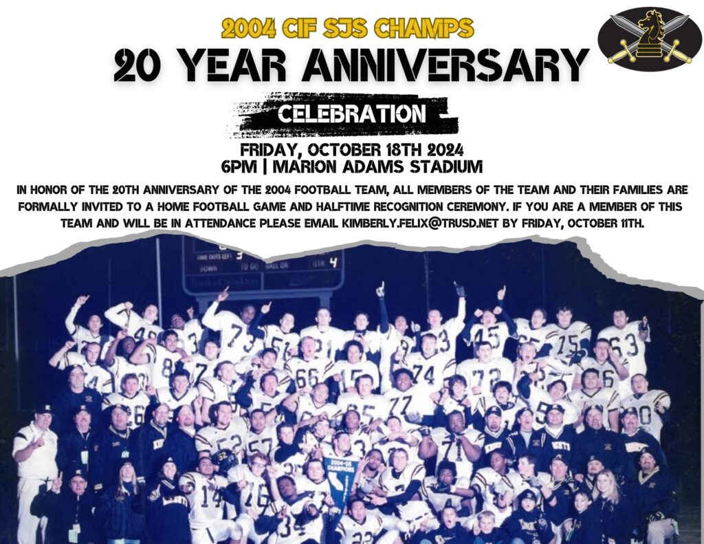 Friday, Oct 18: It’s Knight in Pink night! The Football team takes on El Camino here at Rio Linda in a game you won’t want to miss. This is also a special reunion night celebrating the 2004 Section Champion team, 20 years later! JV kicks off at 5 PM, followed by Varsity at 7 PM.