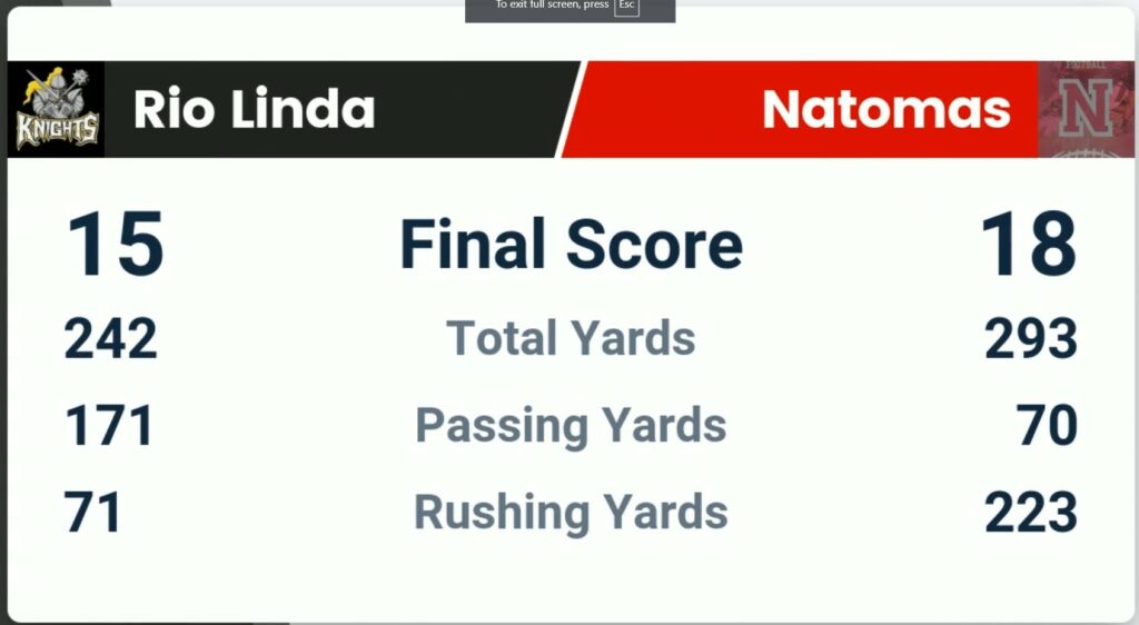 Rio Linda, CA – The Rio Linda Knights showed improvement in their recent matchup against the Natomas Nighthawks, losing by a narrow margin of 18-15. This marks a significant improvement from their 28-point loss to Foothill just a week prior.