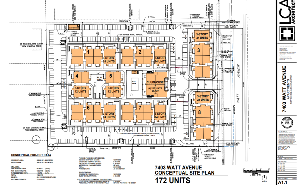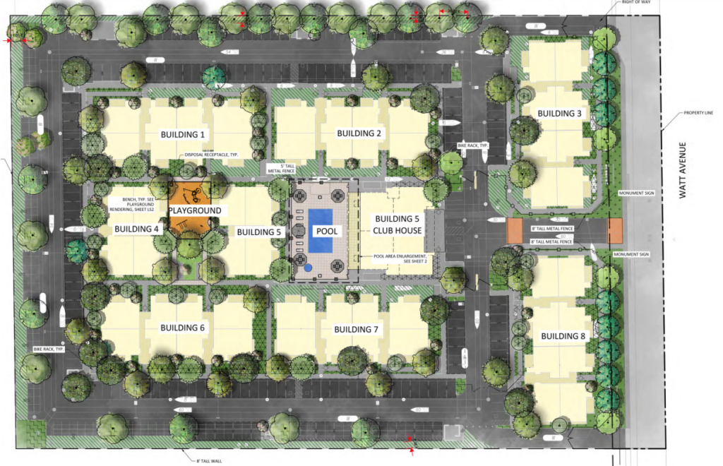 The New Green Apartments at Larchmont Village will feature 172 units in three-story buildings located just south of the Food Maxx shopping center, at the intersection of Watt Avenue and Larchmont Drive in North Highlands.