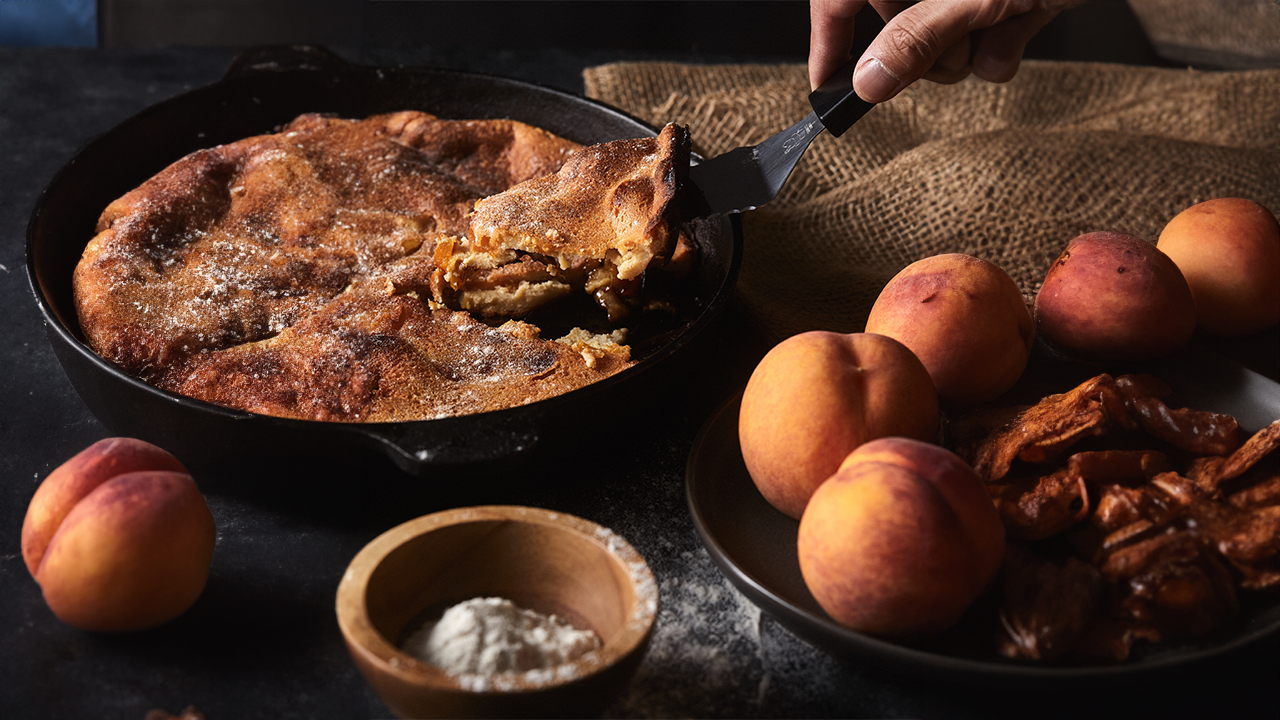 - Prepare the Peaches: Preheat oven to 350°F. In a cast-iron skillet or nonstick pan over medium heat, combine peaches, brown sugar, and lemon juice. Simmer until sugar melts and liquid thickens slightly (2-4 minutes). Set aside in a bowl. Add more lemon juice if needed for a brighter flavor.
